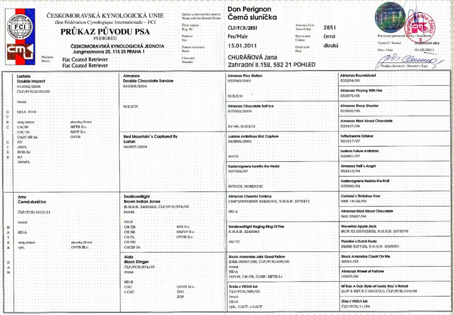 Po labradorovi Drakovi, který si o rodokmenu mohl nechat zdát, a golden retrievrovi, jeho velkovelebnosti Argovi od Rožmberské hráze, se do naší smečky včlenil flat coated retriver Don Perignon Černá sluníčka.